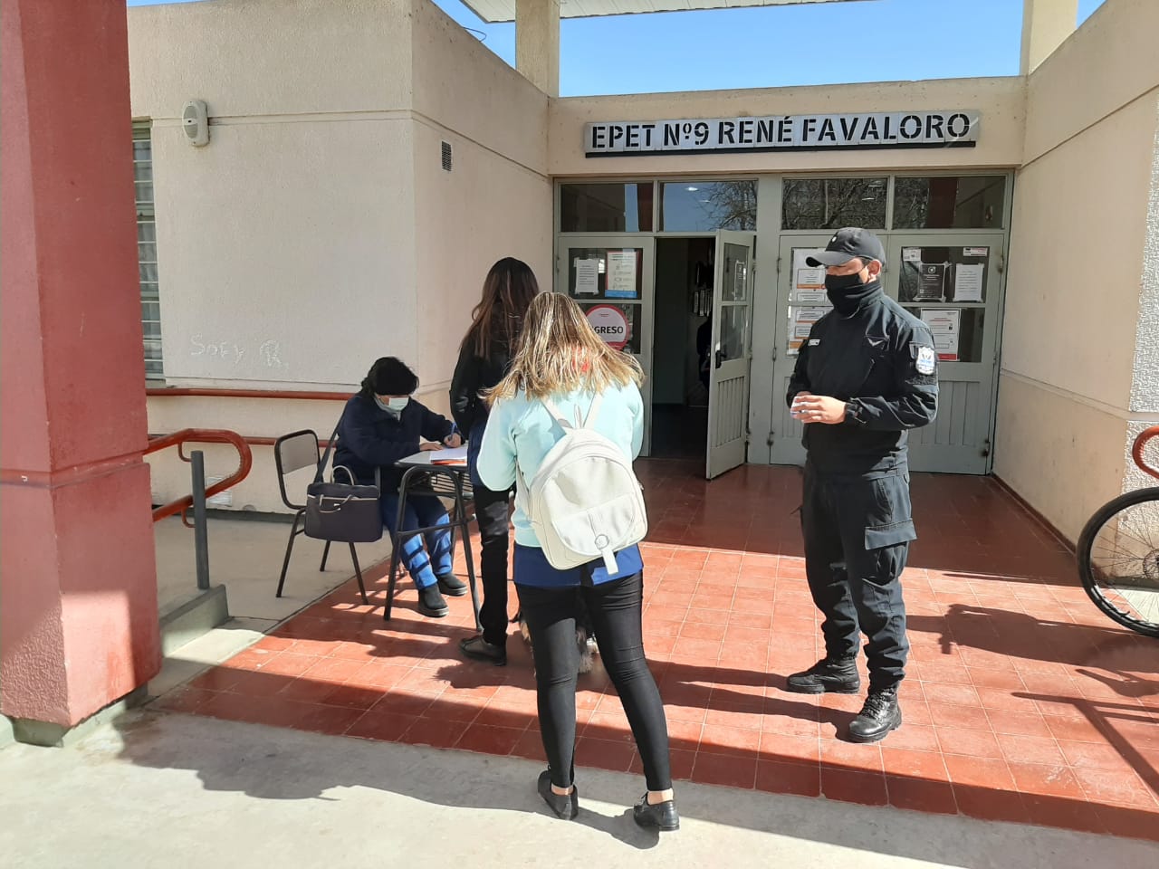 La “nueva normalidad” cambió todo. Todo. En el turno tarde, en la puerta del colegio, sentado detrás de un pupitre, hay un policía que toma la temperatura de quienes vienen a clases. Al lado, personal de la escuela salud toma nota de los asietnte. Y más allá, les entregan el kit que ahora será su fiel compañero: una bolsita con alcohol en gel, un barbijo, un jabón de tocador y una toalla personal, todo según lo dispuso el Ministerio de Educación provincial.
