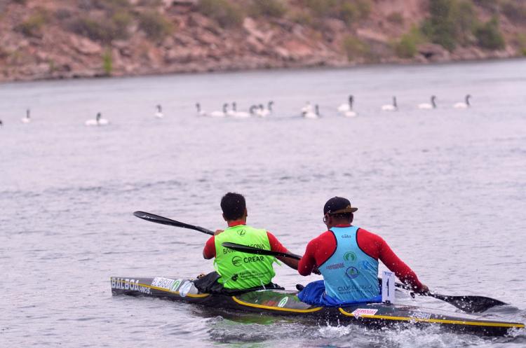 En el primer pelotón que entró en contacto con el agua se encontraban los dos kayacs favoritos. Por un lado los actuales bicampeones Franco Balboa-José Luis Guerrero (El Biguá), y por el otro la dupla que ya lleva una docena de victorias corriendo juntos, Pinta-Mozzicafreddo. Los del club neuquino salieron muy fuerte, con intenciones de cortarse. Pero según como lo manifestó Balboa al finalizar la prueba, la presencia de lama en el lecho del río, conspiró ante el tempranero intento de escapada.