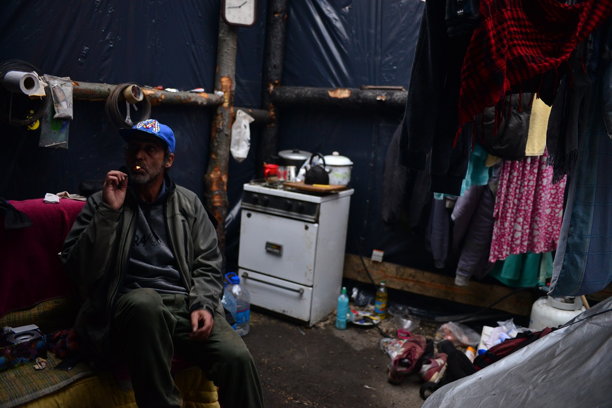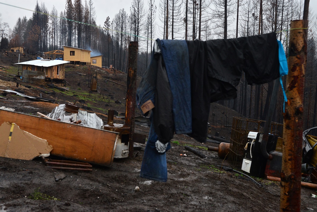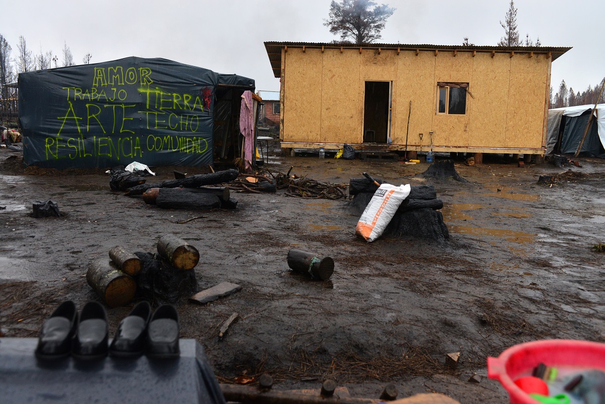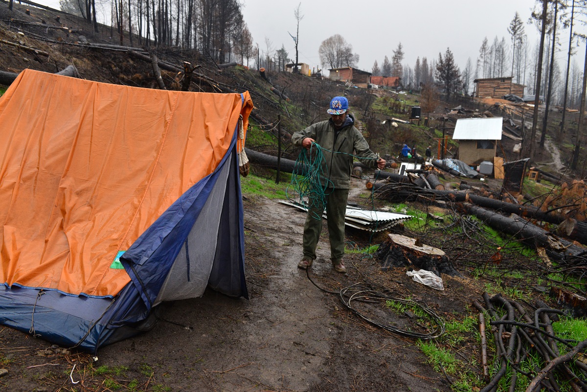 “Levanté el techo con pallets y las paredes son de nylon, cubiertas con chapas quemadas”, describe. La lluvia intensa se filtra por varios lugares. Pablo duerme hace en una carpa, montada sobre un pallet, para tratar de evitar la humedad. Una pequeña salamandra brinda un poco de calor, pero el frío es demasiado intenso. Las paredes de nailon se sostienen con tirantes improvisados de los pinos quemados. Perdió sus herramientas de trabajo y desde hace mucho tiempo que no puede ir a la feria de El Bolsón como para tratar de generar algún ingreso de su oficio de artesano. Dice que lo que más necesitan es el agua.