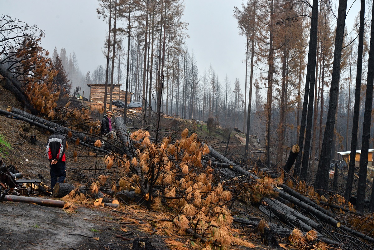 La tierra aún está arrasada en la parcela 26 de Lago Puelo. La corteza de los pocos pinos que siguen en pie está quemada. El gris domina el entorno y combina con el suelo arcilloso de esa tierra, donde decenas de familias resisten como pueden. La misma escena se percibe en la Ecoaldea y el barrios Bosques del Sur. Allí, los colores aún no volvieron a ese rincón de la Patagonia que el fuego redujo a escombros y cenizas la tarde del 9 de marzo pasado.