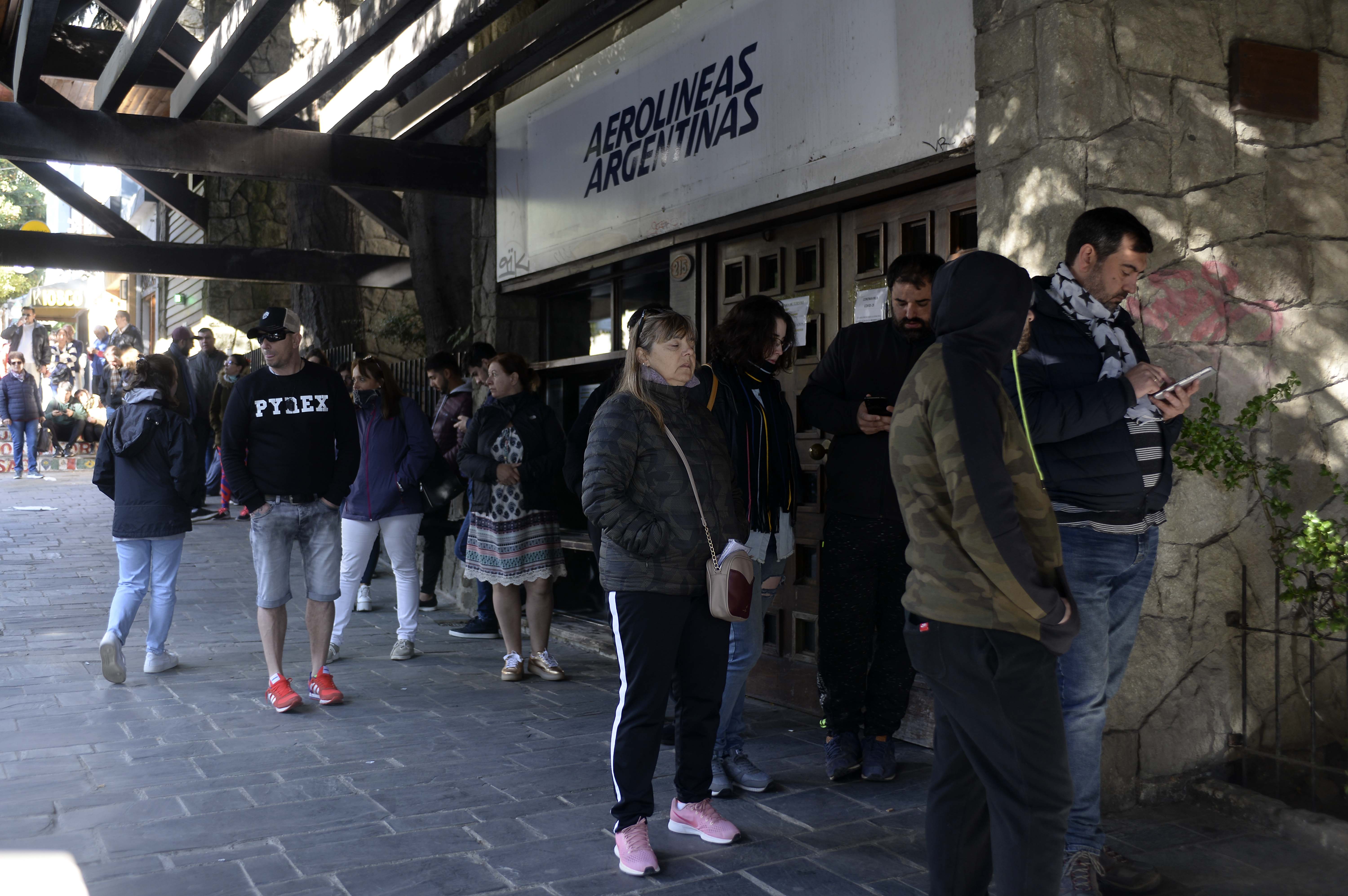 Horas antes de su apertura, una larga hilera de gente esperaba afuera de la oficina de Aerolíneas Argentinas en la calle Mitre, con la intención de reprogramar los vuelos.
