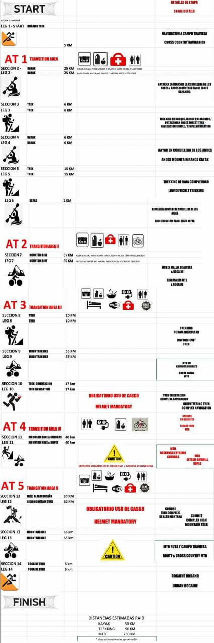 Son 350 kilómetros en los que los participantes deberán mostrar habilidad y resistencia, corazón y coraje, mentalidad y estrategia. Al cierre de la primera área de transición, tras un trekking corto, el equipo Merrel, compuesto por competidores de Suecia, Dinamarca y Nueva Zelanda, lideraba las posiciones, seguidos por Uruguay US y Nuna Ride, en segunda y tercera posición. En sexto lugar marchaba el team ATSA RN, integrado por los roquenses Mónica Ñanculef, Andrés Valenzuela, y el barilochense Juan Ignacio Beltrán.