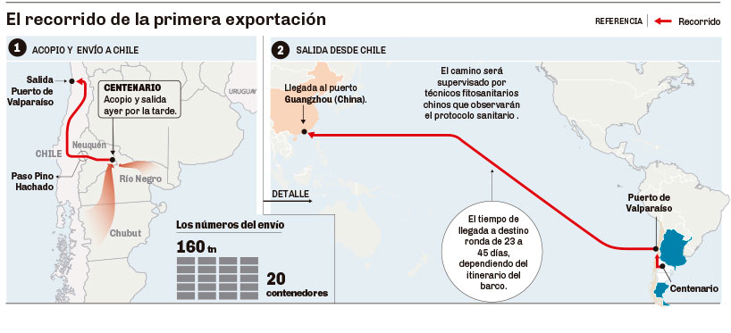 Los auditores del país asiático avalaron la cadena de control que se realiza a nivel local. El envío inicial partió ayer desde Centenario con 160 toneladas. El cargamento incluye frutas de Neuquén, Río Negro y Chubut y abre un mercado al que no se había podido llegar. El desafío ahora es trasladarlas en avión.