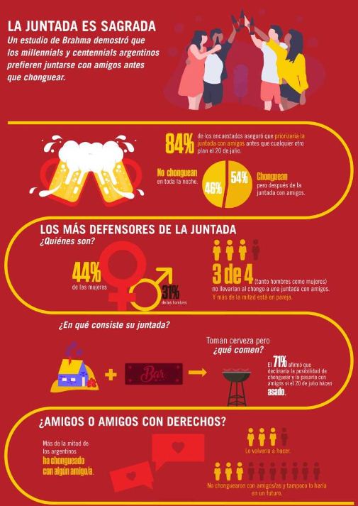 ¿Y cómo se componen estas famosas juntadas? Siempre incluye cerveza, pero lo que inclina la balanza entre los indecisos es el plato fuerte: en el caso de haber asado con amigos, el 71% declinaría la posibilidad de chonguear y preferiría juntarse con su grupo.