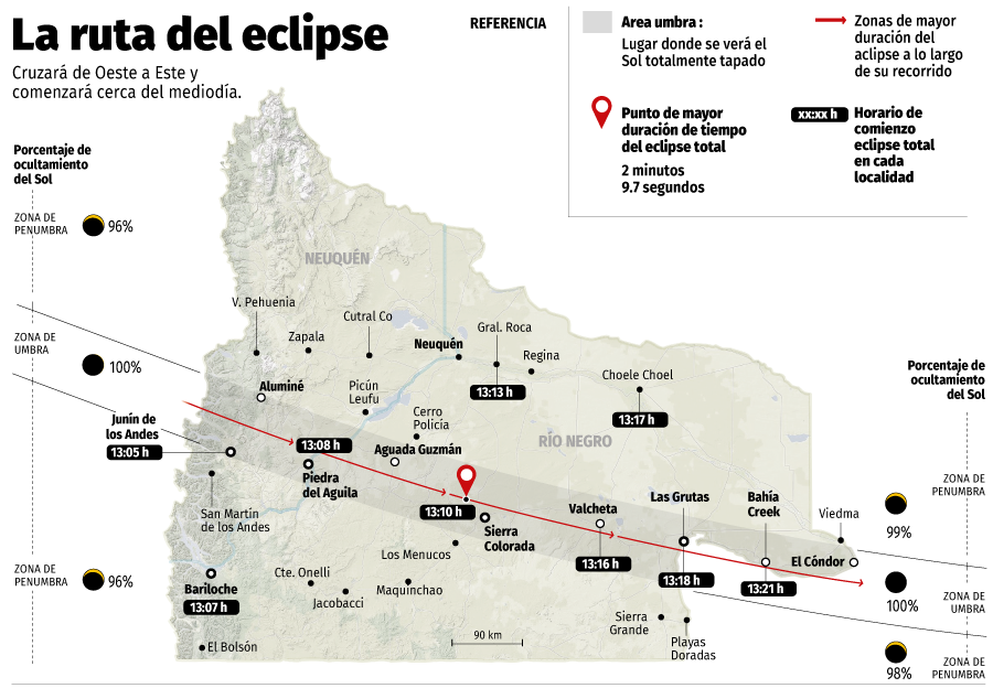 Este lunes 14 de diciembre de 2020 entre las 13.05 y las 13.25 horas la sombra de la Luna atravesará las provincias de Neuquén y Río Negro, pasando por las localidades de Junín de los Andes, Piedra del Águila, Sierra Colorada, Ministro Ramos Mexía, Valcheta, Las Grutas y San Antonio Oeste.