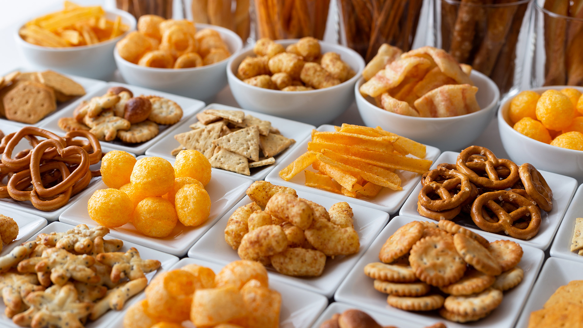 Rows of many types of savory snacks in white ceramic dishes.