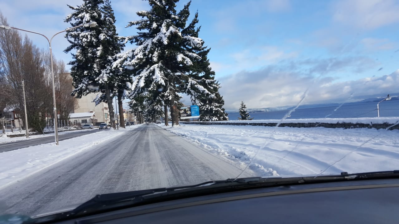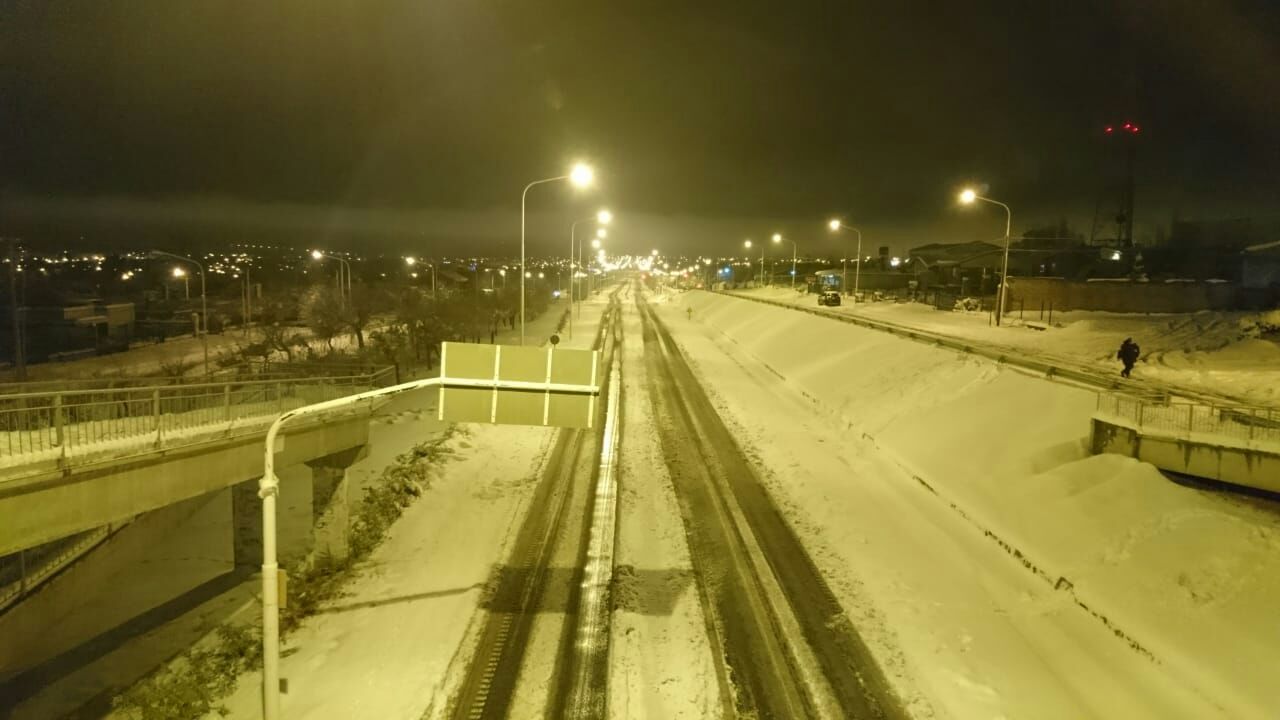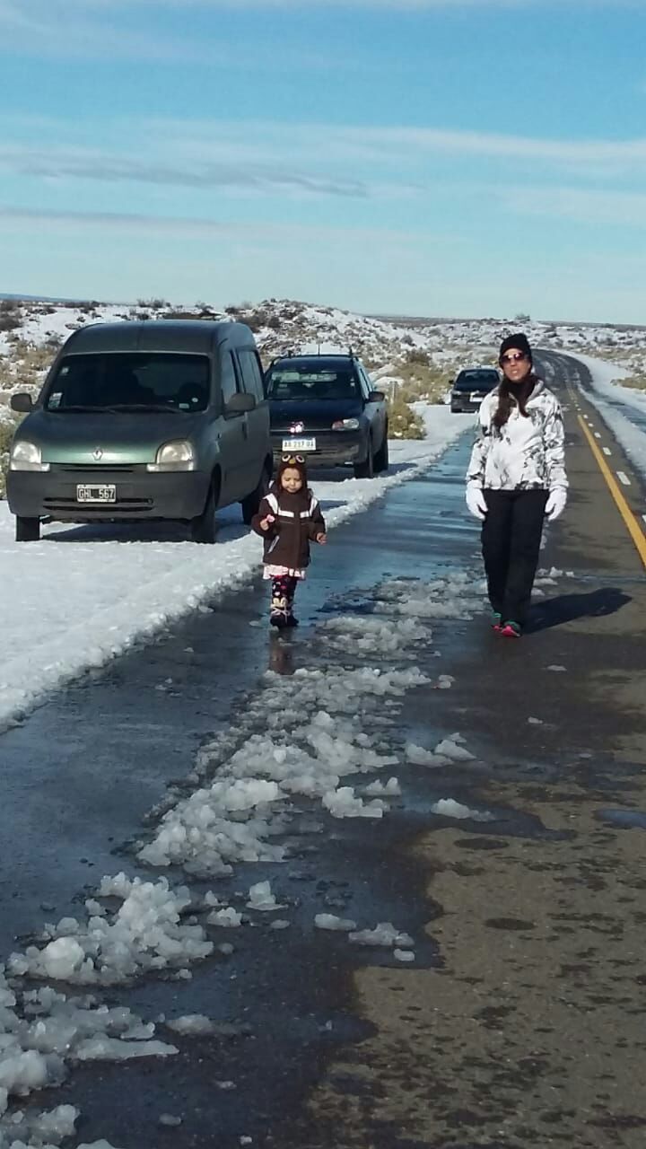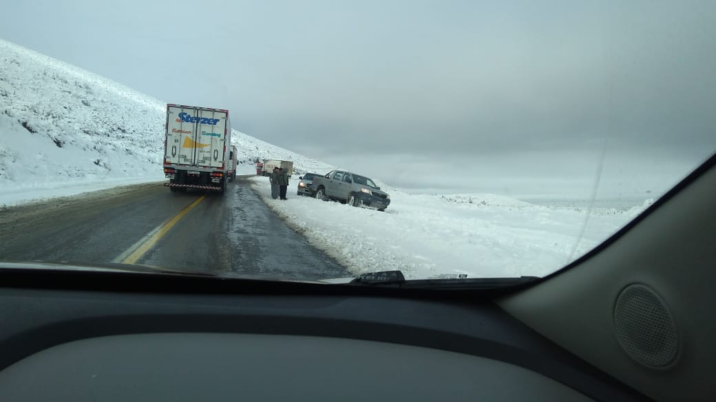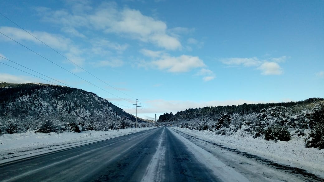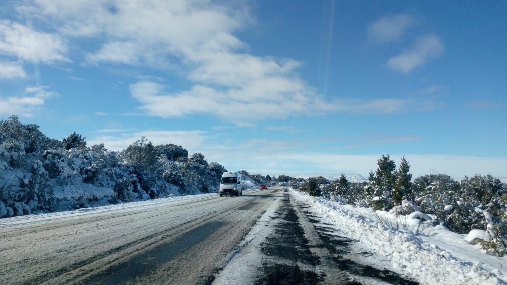 En cercanías de Alicurá puede distinguirse el hielo en la ruta.