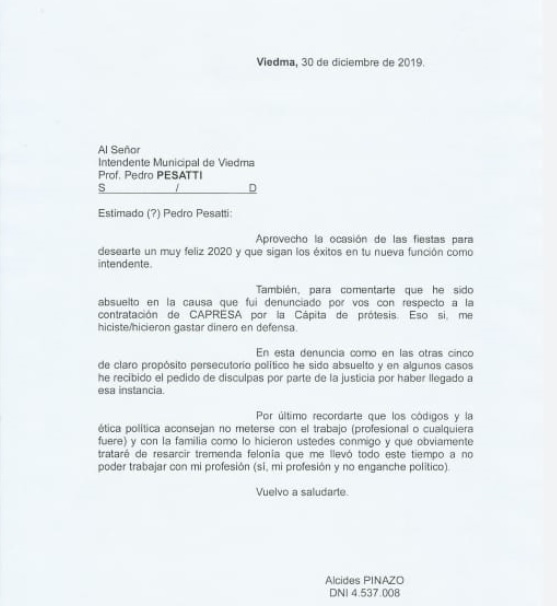 “He sido absuelto en la causa que fui denunciado por vos con respecto a la contratación de Capresa por la cápita de prótesis. Eso sí, me hiciste/hicieron gastar dinero en defensa”, le señaló Pinazo a Pesatti, luego de desearle en forma particular “que sigan los éxitos en tu nueva gestión como intendente” de Viedma.