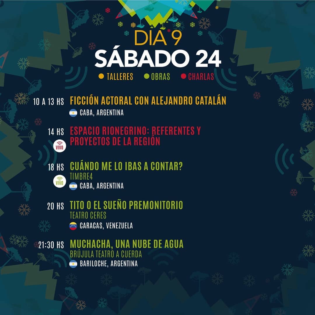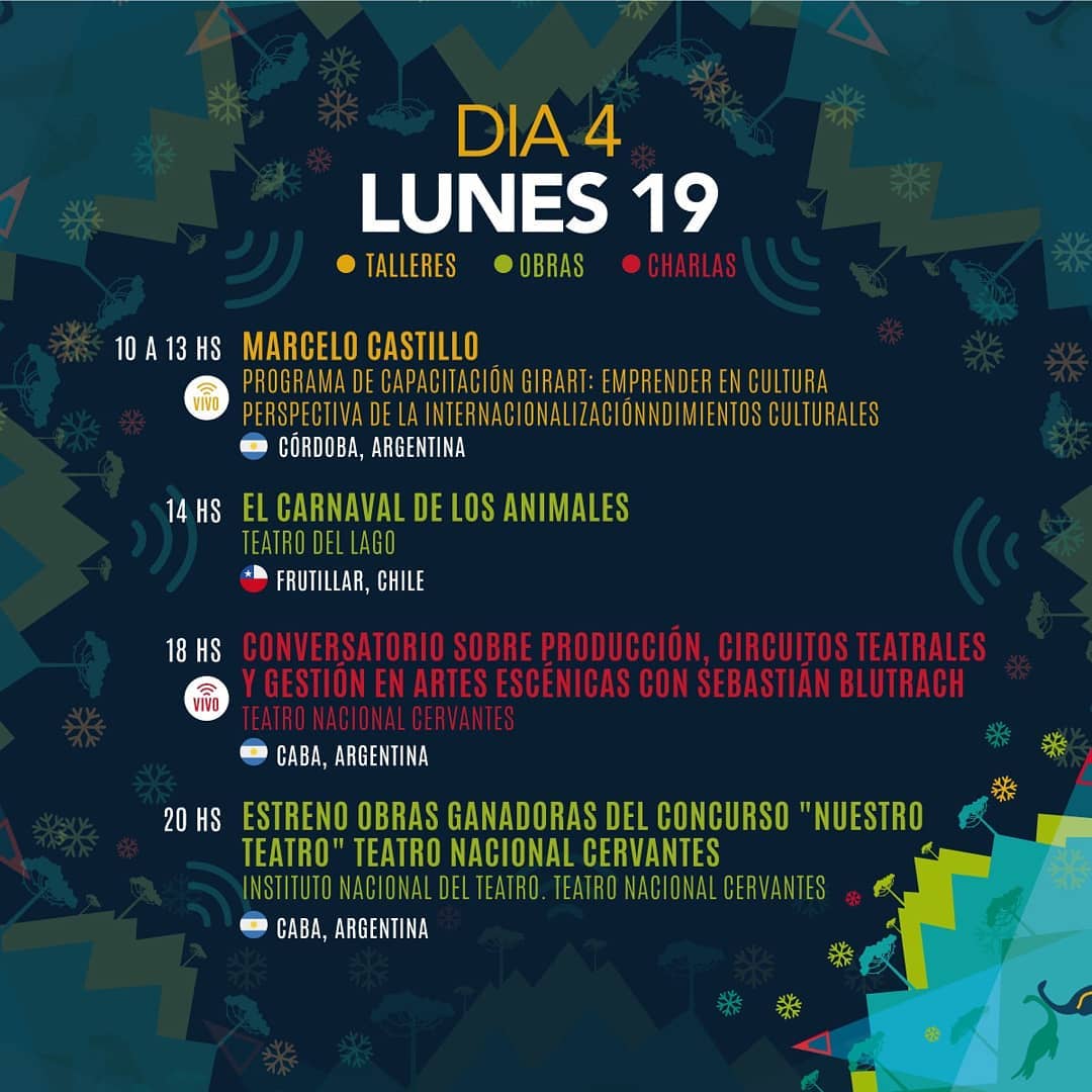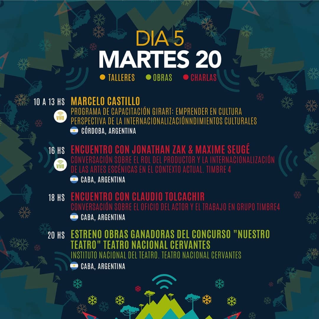 En esta oportunidad, se compartirán las obras ganadoras del concurso “Nuestro Teatro”, del Teatro Nacional Cervantes. El actor Luis Machin será parte de las Conversaciones Nevadas, junto a Sebastián Blutrach que hablará sobre producción, circuitos teatrales y gestión en artes escénicas. También estará presente “Teatro del Lago”, uno de los centros culturales más importantes de Sudamérica en Chile. Y el espacio Timbre 4, compañía y escuela dirigida por Claudio Tolcachir, se sumará con obras teatrales y espacios de charla.