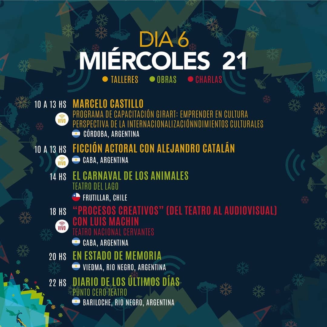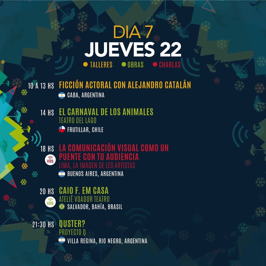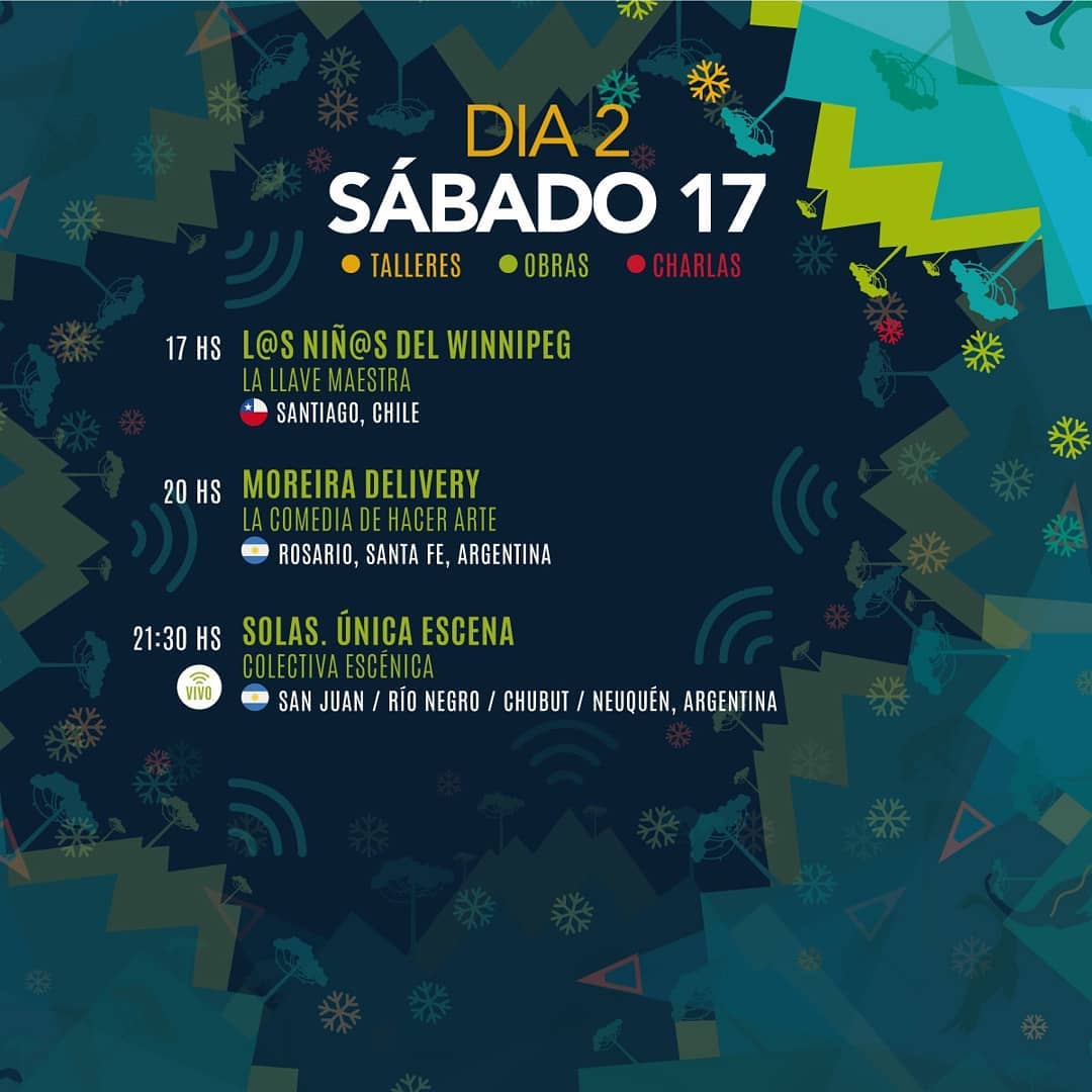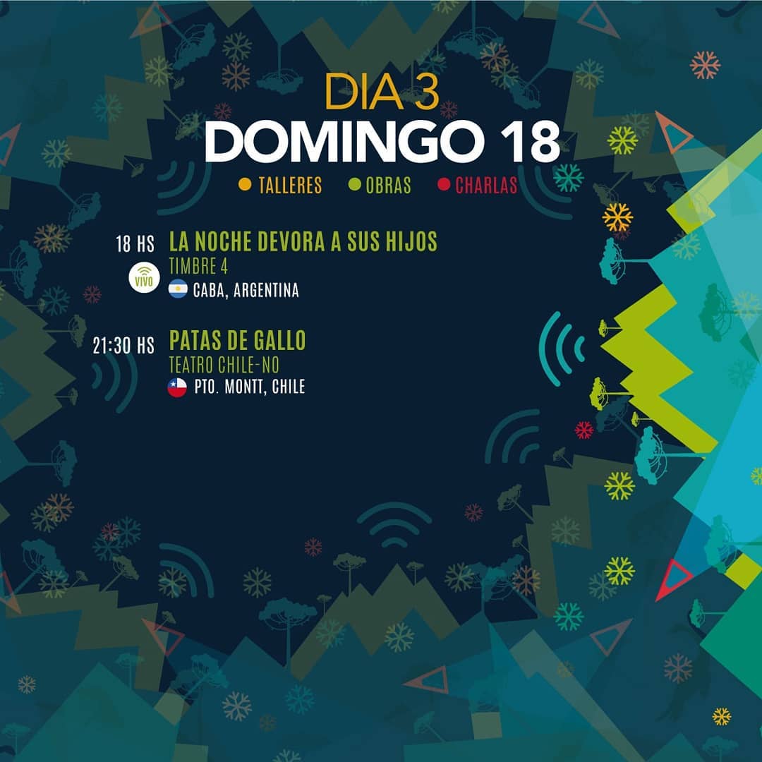 En esta oportunidad, se compartirán las obras ganadoras del concurso “Nuestro Teatro”, del Teatro Nacional Cervantes. El actor Luis Machin será parte de las Conversaciones Nevadas, junto a Sebastián Blutrach que hablará sobre producción, circuitos teatrales y gestión en artes escénicas. También estará presente “Teatro del Lago”, uno de los centros culturales más importantes de Sudamérica en Chile. Y el espacio Timbre 4, compañía y escuela dirigida por Claudio Tolcachir, se sumará con obras teatrales y espacios de charla.