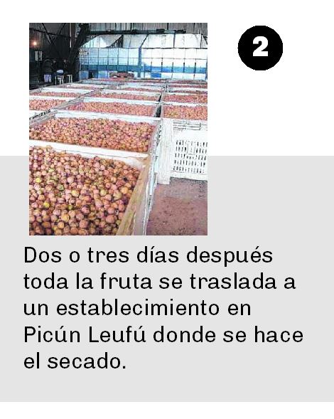 Desde el organismo uno de los acompañamientos fue el financiamiento para que el productor que lleva la fruta hacia el establecimiento de Picún Leufú , que es donde se reúne todo la fruta con destino a exportación, “no cargue con el costo del secado y del procesamiento hasta que esté el retorno de la venta”.