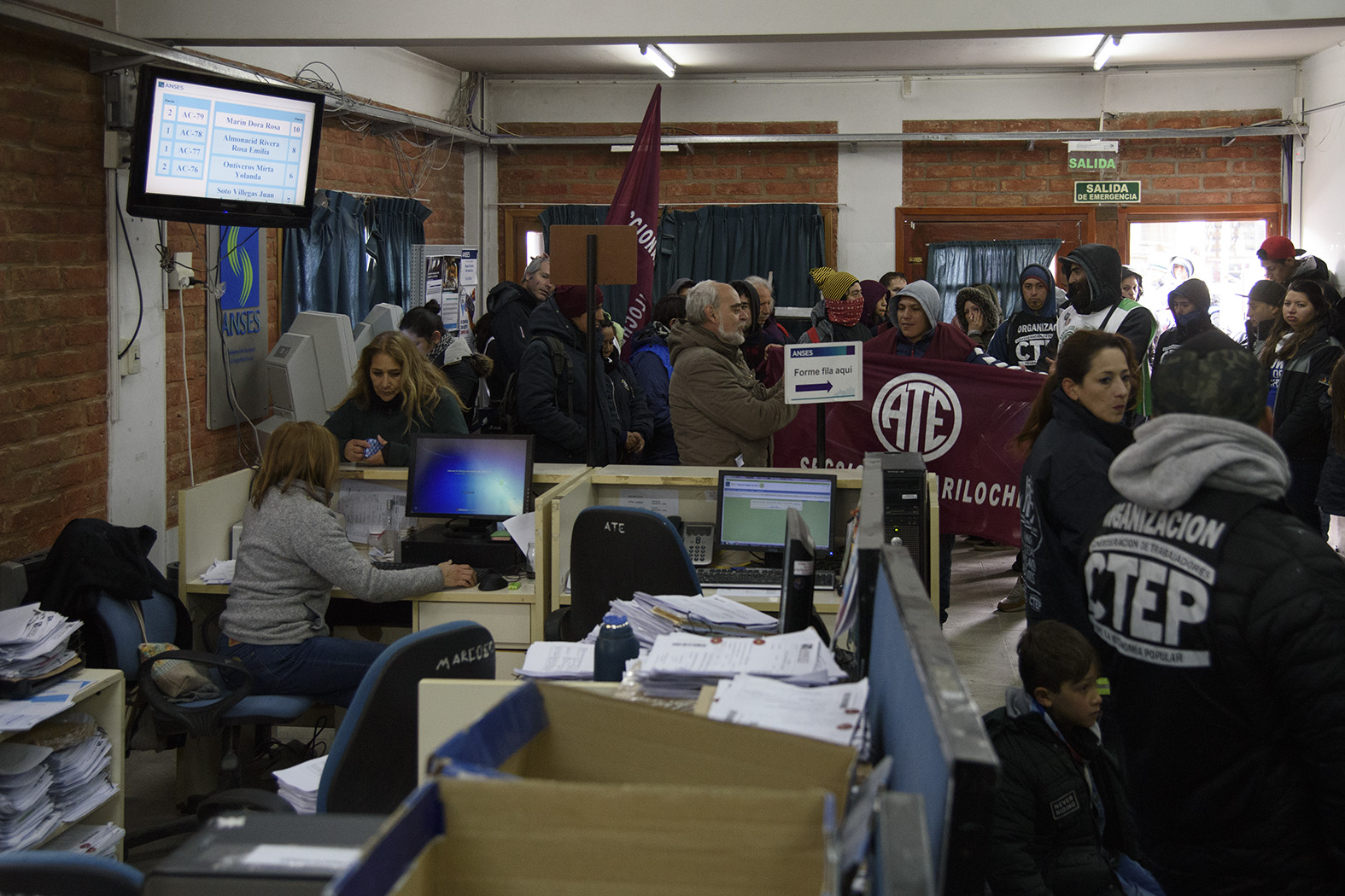 Integrantes de la Confederación de Trabajadores de la Economía Popular (CTEP), la Corriente Clasista y Combativa (CCC) y el Abuelazo Bariloche ocuparon la delegación de la Anses esta mañana. Reclamaron un aumento “de emergencia” de la Asignación Universal por Hijo, de las pensiones, las jubilaciones y los planes sociales.