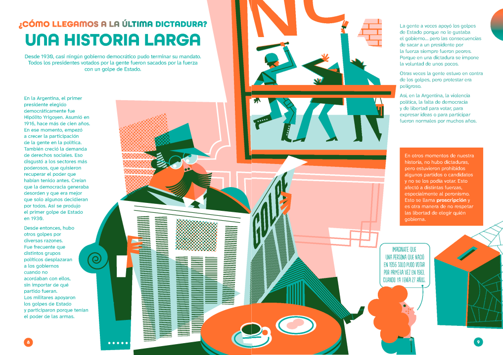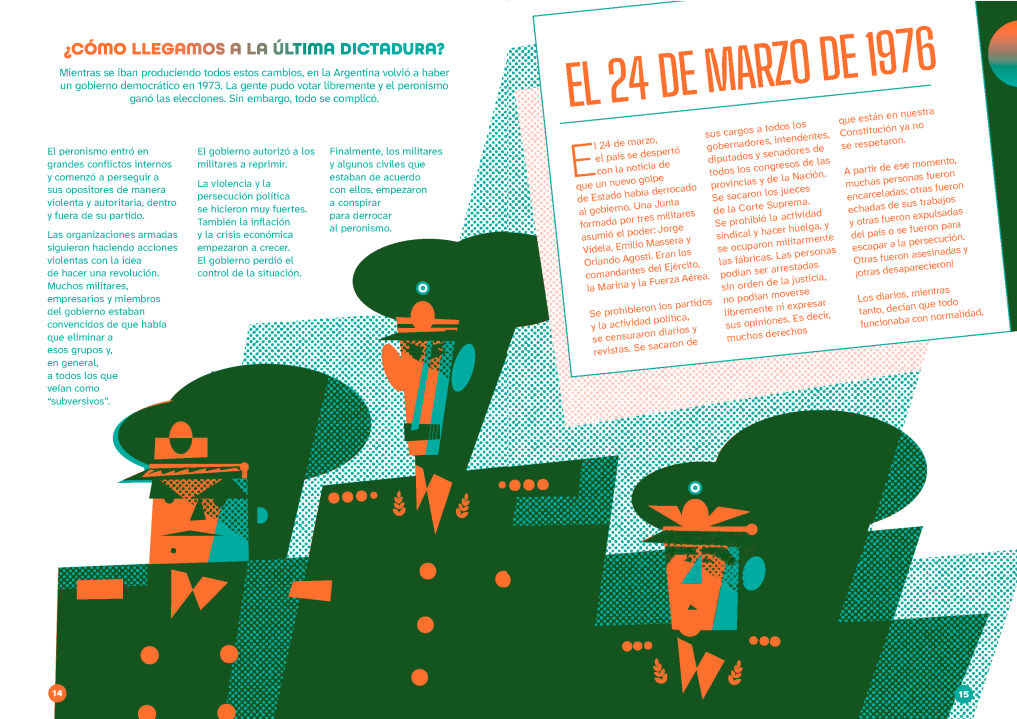 Con un despliegue a doble página, cada una de ellas aborda un tema central: el proyecto económico, la represión y la censura, la Guerra de Malvinas del 82, el Mundial de 1978, la llamada “teoría de los dos demonios”, el rol de los organismos de derechos humanos y el retorno a la democracia, entre otros. La estructura permite una lectura lineal, como relato histórico, o bien un abordaje temático por capítulos. Y el tema, que está pensado para ser leído un público a partir de los 10 años, incluye hasta a los adultos que pueden participar en el ida y vuelta que se genera con los chicos.