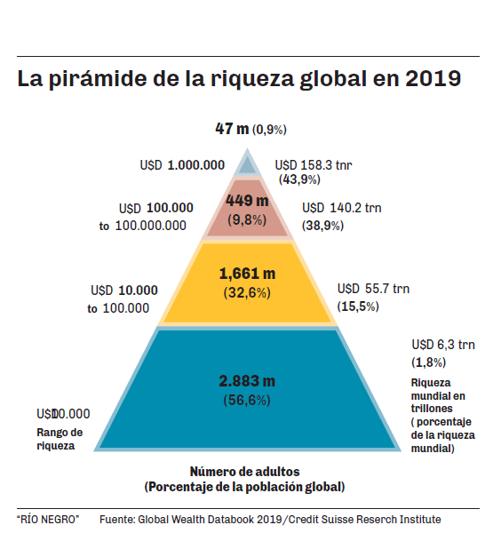 El gráfico que acompaña la nota, muestra los números con más detalle. Allí se observa la ‘pirámide de la riqueza global’. En la base se encuentran quienes tienen una riqueza inferior a los u$s 10.000 y en la cúspide quienes tienen una fortuna mayor a u$s 1.000.000. Se advierte con claridad que el 0,9% de la población mundial, tiene en sus manos el 43,9% de la riqueza total del mundo, y que el 10,7% más rico de la población global, acumula el 82,8% de la riqueza del mundo.