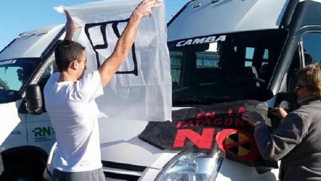 Un grupo de ambientalistas lo recibieron en el aeropuerto de Viedma con carteles de oposición a la instalación de la planta nuclear mientras los integrantes de la delegación se subían a dos traffic del ministerio de Turismo de Río Negro que los esperaban.