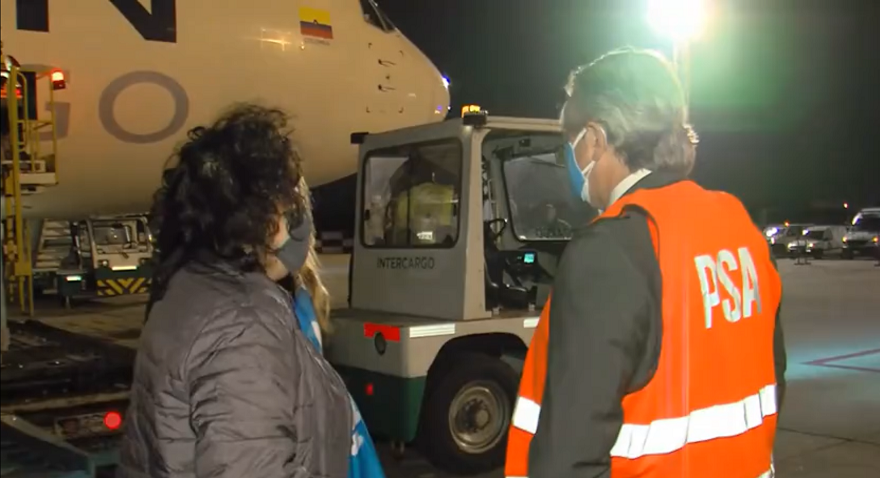 El vuelo Uc1407 de la compañía Latam Cargo Colombia arribó al aeropuerto internacional de Ezeiza a las 17.45, procedente de Miami y en la estación aérea fue recibido por Fernández, entre otras autoridades.
