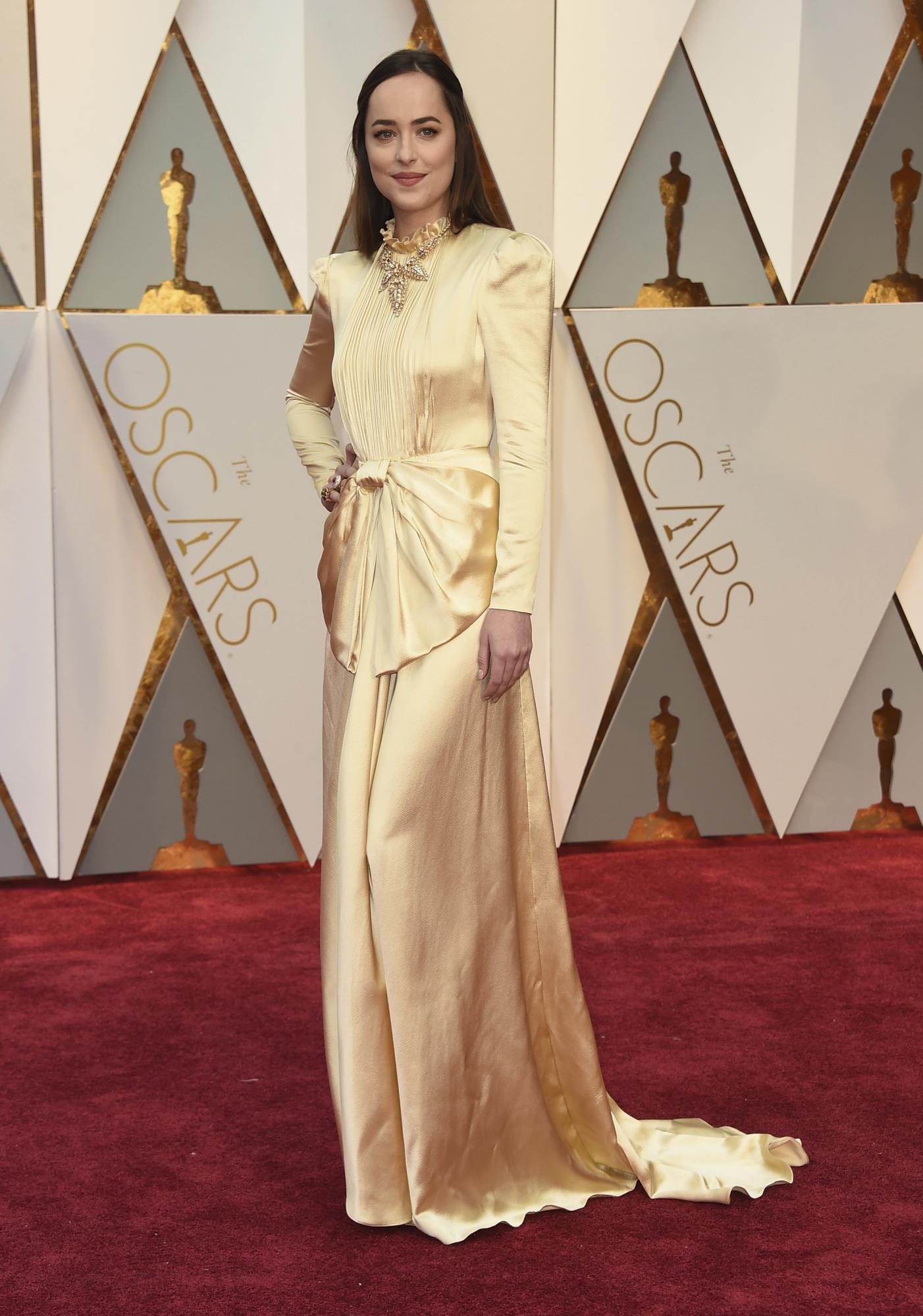 DAKOTA JOHNSON: También de Gucci, la protagonista de la recién estrenada “50 Shades Darker” desató otra de las tormentas tuiteras de la alfombra roja. Su apuesta vintage en dorado, con cuello victoriano y un maxi lazo en la cintura, fue calificada por algunos de “elegancia personificada”, aunque otros se preguntaban si llevaba un delantal.