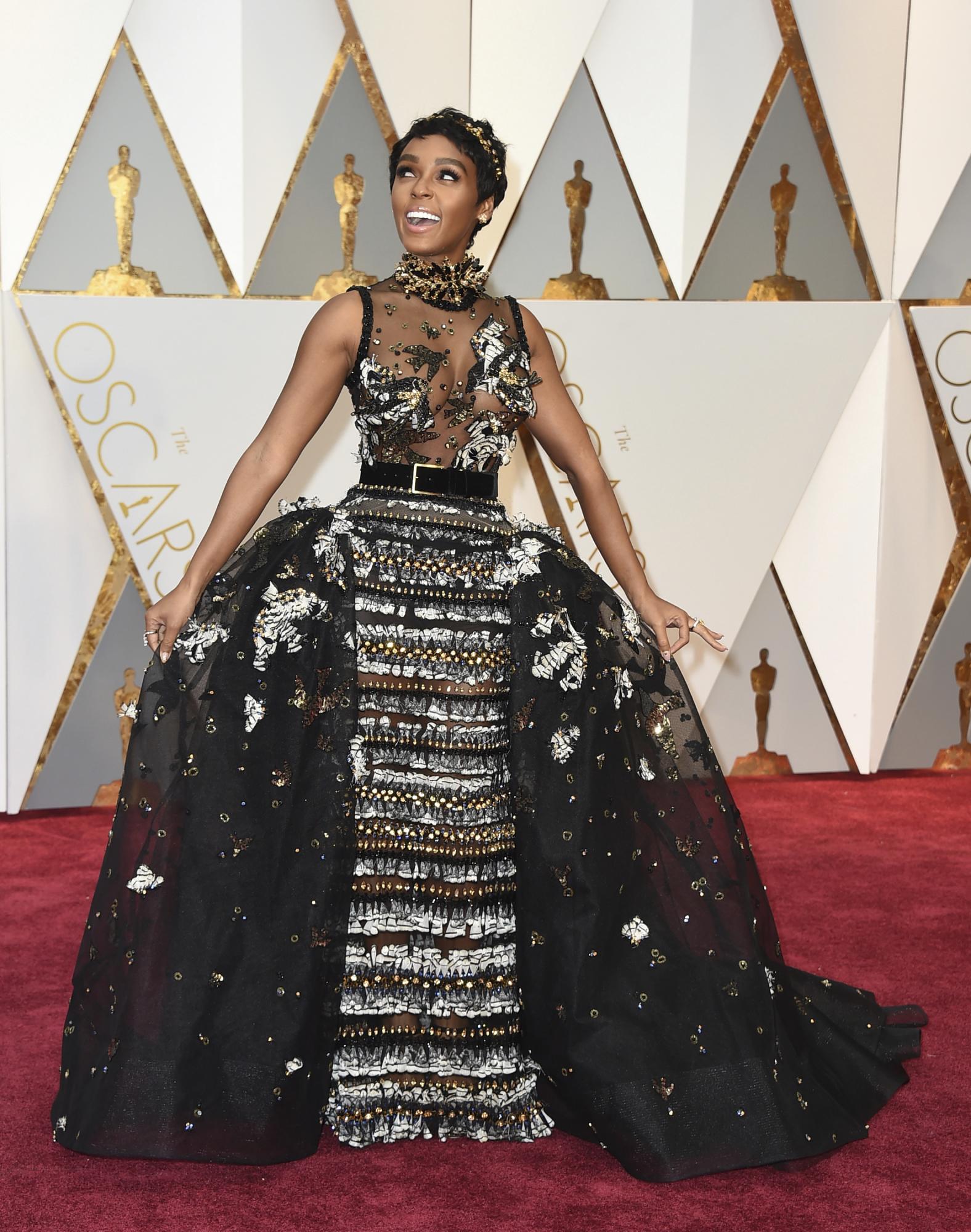 JANELLE MONÁE: La guapa cantante y actriz de “Moonlight” se sentía, según su asesora de estilo, “como una reina”, sólo que al parecer se equivocó de siglo. Su debut en la alfombra roja de los Oscar, con un Elie Saab de tul, diamantes y cristales en negro, recordaba por su voluminosa falda a Isabel I de Inglaterra (1533-1603).