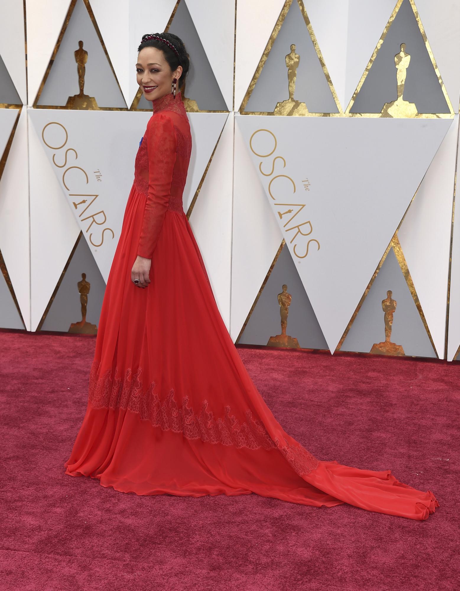 RUTH NEGGA: Nacida en Etiopía, la nominada a Mejor Actriz por “Loving” triunfó con su vestido rojo de Valentino con transparencias en el escote, cuello alto y manga larga. Lo combinó con una fina diadema de piedras en rojo y le añadió el toque reivindicativo con la cinta azul celeste de la asociación ACLU en apoyo a los derechos civiles.