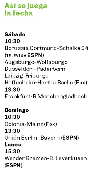 El capítulo 26 se disputará entre sábado, domingo y lunes y lo hará con 9 partidos que involucrarán a los 18 conjuntos de primera división. Hay presencia argentina en cuatro equipos: Santiago Ascacibar (Hertha Berlín), Exequiel Palacios y Lucas Alario (Leverkusen), Leo Balerdi (Dortmund) y David Abraham (Frankfurt).