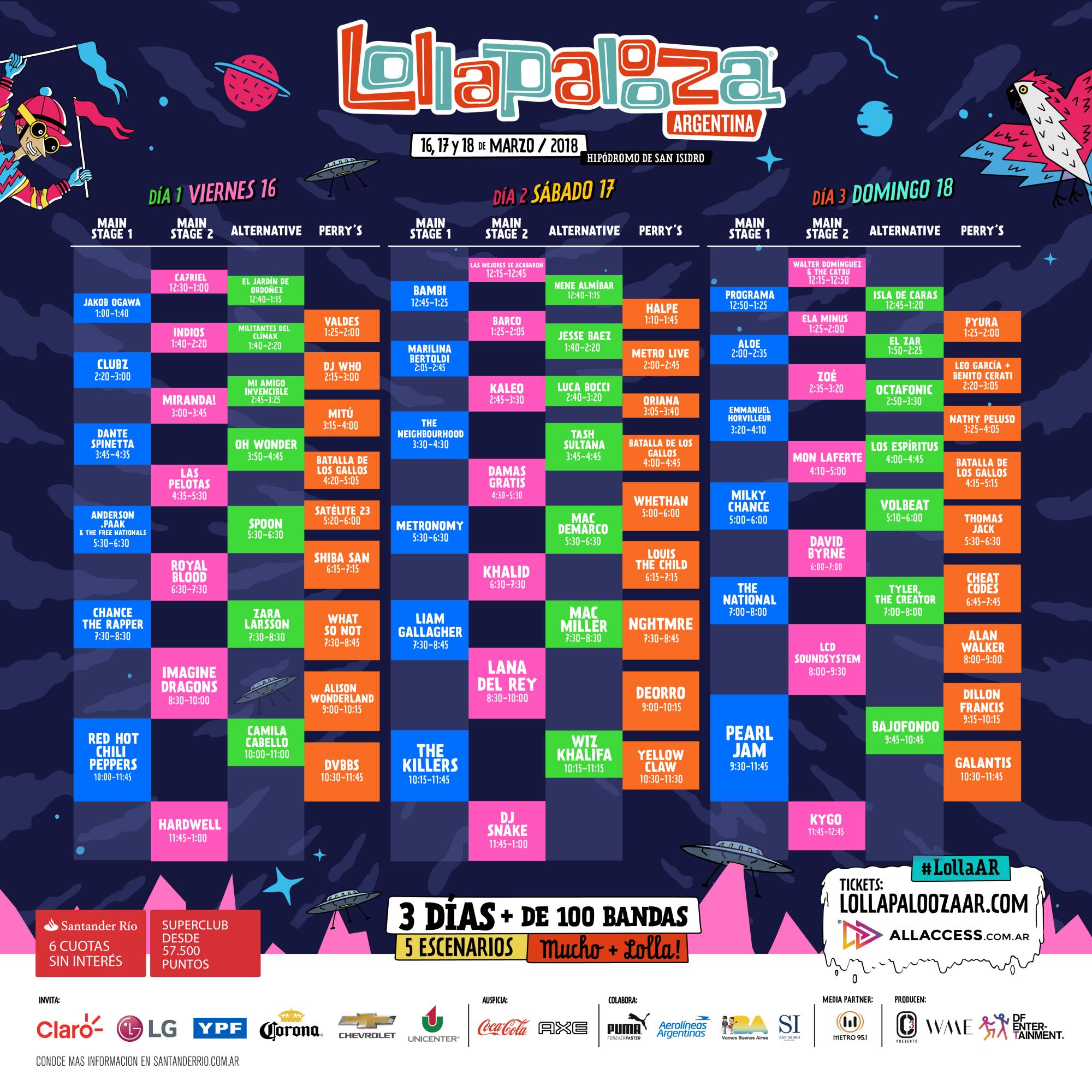 Lollapalooza Argentina hizo oficial los horarios de los shows de los más de 100 artistas que participarán en festival los próximos viernes 16, sábado 17 y domingo 18 de marzo. Ahora sí, los fanáticos podrán armar su itinerario de shows que, desde las 12 del mediodía, podrán disfrutar en el Hipódromo de San Isidro. El viernes 16 tendrá un Main Stage 1 de lujo que contará con los shows de Red Hot Chili Peppers, Chance The Rapper y Anderson. Paak & The Free Nationals, mientras que Hardwell, Imagine Dragons, Camila Cabello y Zara Larsson, serán recibidos por el público argentino en el Main Stage 2 y el escenario Alternative.