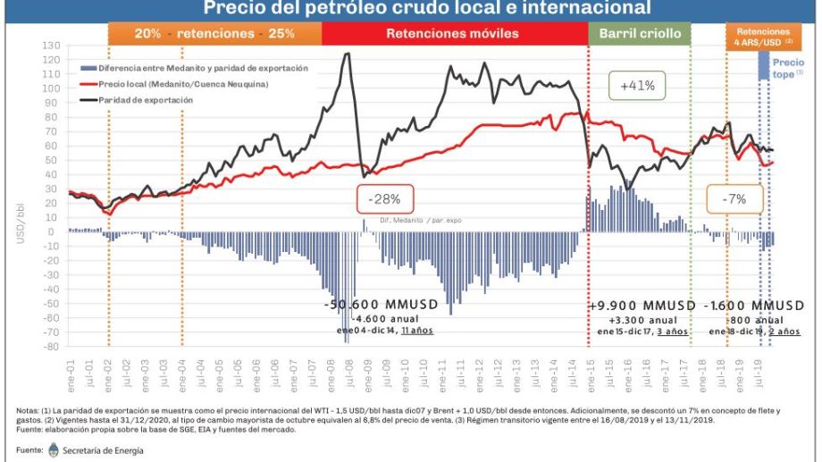 Para fundar su posición, Lopetegui presentó una línea de 20 años de evolución del precio del petróleo dentro del país y del precio internacional de referencia que parte de enero de 2001 y llega hasta este mes. En la gráfica se observa el impacto de las retenciones fijas y móviles que a partir de 2004 separan el precio local, depreciándolo del internacional.