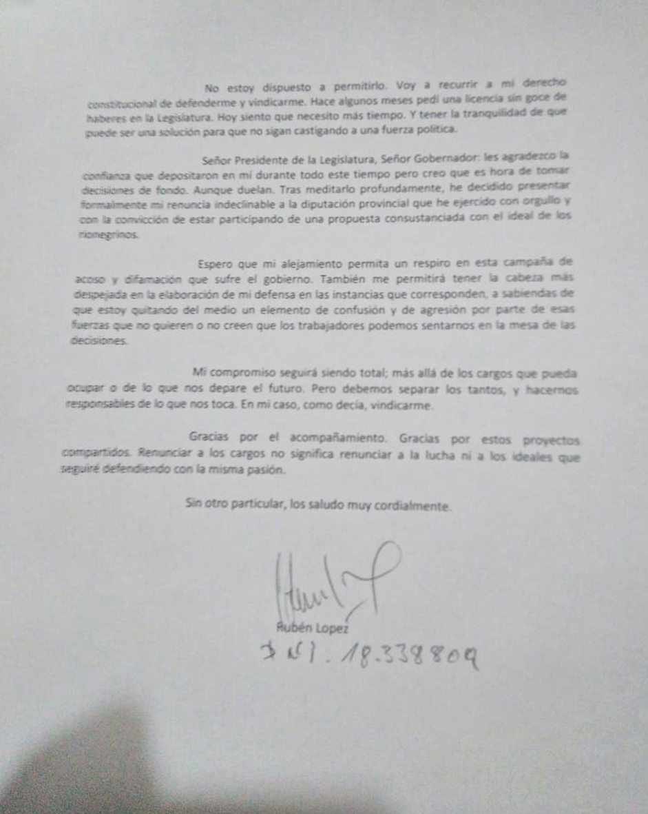 La dimisión fue su respuesta al procesamiento por “abuso simple” que ya habría resuelto la jueza Sonia Martín. Esta resolución se corresponde con una denuncia realizada por una empleada doméstica por “tocamientos impúdicos” contra López. Además la joven se presentó hoy en la Fiscalía de Allen para denunciar que anoche fue abordada por tres sujetos, quienes la amenazaron con un arma de fuego. Igualmente, el hecho de mayor trascendencia contra el ahora ex legislador correspondió con otra denuncia de abuso sexual, formalizada por otra joven.