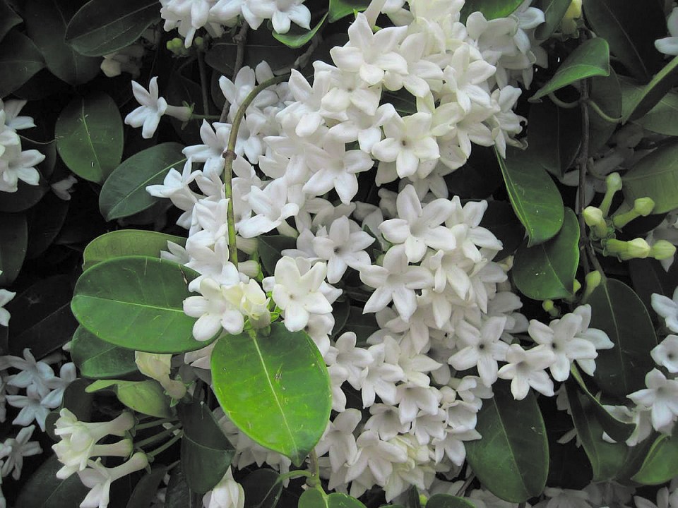 3.-Stephanotis floribunda: Conocido como jazmín de Madagascar es de origen africano Oriental y se trata en este caso de un arbusto trepador de hoja perenne, con una hermosa cualidad de enroscarse en columnas y convivir entre otras especies, que le dan cobijo cuando están en el exterior, comenta Ángel.