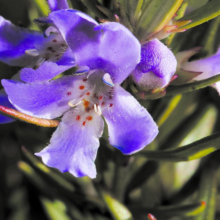 Con hojas muy pequeñas de color verde grisáceo y blancuzcas al dorso, casi plateadas brinda un detalle característico por sus bellos contrastes en el jardín. Su floración es muy prolongada, casi anual – acota Rovira Bosch – y cuya flor en los extremos de las ramificaciones nace en un color azulado.
