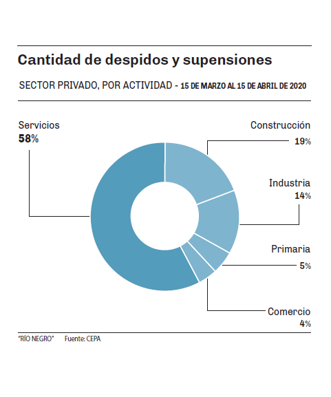 Un estudio realizado por el Centro de Economía Política Argentina (Cepa), revela que desde el inicio de la cuarentena y hasta mediados de abril se registraron 5.386 despidos y 7.223 suspensiones. Al mismo tiempo, existen otras 297.000 personas que padecen algún tipo de riesgo salarial. Se trata de personas que fueron suspendidas con recorte de haberes, que recibieron algún tipo de rebaja salarial, o cuyos empleadores registran atraso en el pago. El panorama es dramático, en tanto comienza a afectar severamente la cadena de pagos. La presión que existe sobre el gobierno para que luego del 10 de mayo exista una flexibilización mucho más amplia, comienza a sentirse como nunca antes desde la llegada del virus.