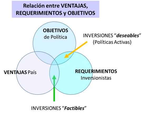De la intersección entre las ventajas del país y los requerimientos de los inversionistas surgen los proyectos que tienen viabilidad para concretarse, pero si estos no coinciden con los objetivos de política del país, no hay razón aparente para ejecutar políticas activas para atraerlos. A su vez, los objetivos de política pueden no tener eco en los requerimientos de las empresas, más aún cuando el país no tiene ventajas que lo hagan atractivo en dichos proyectos.