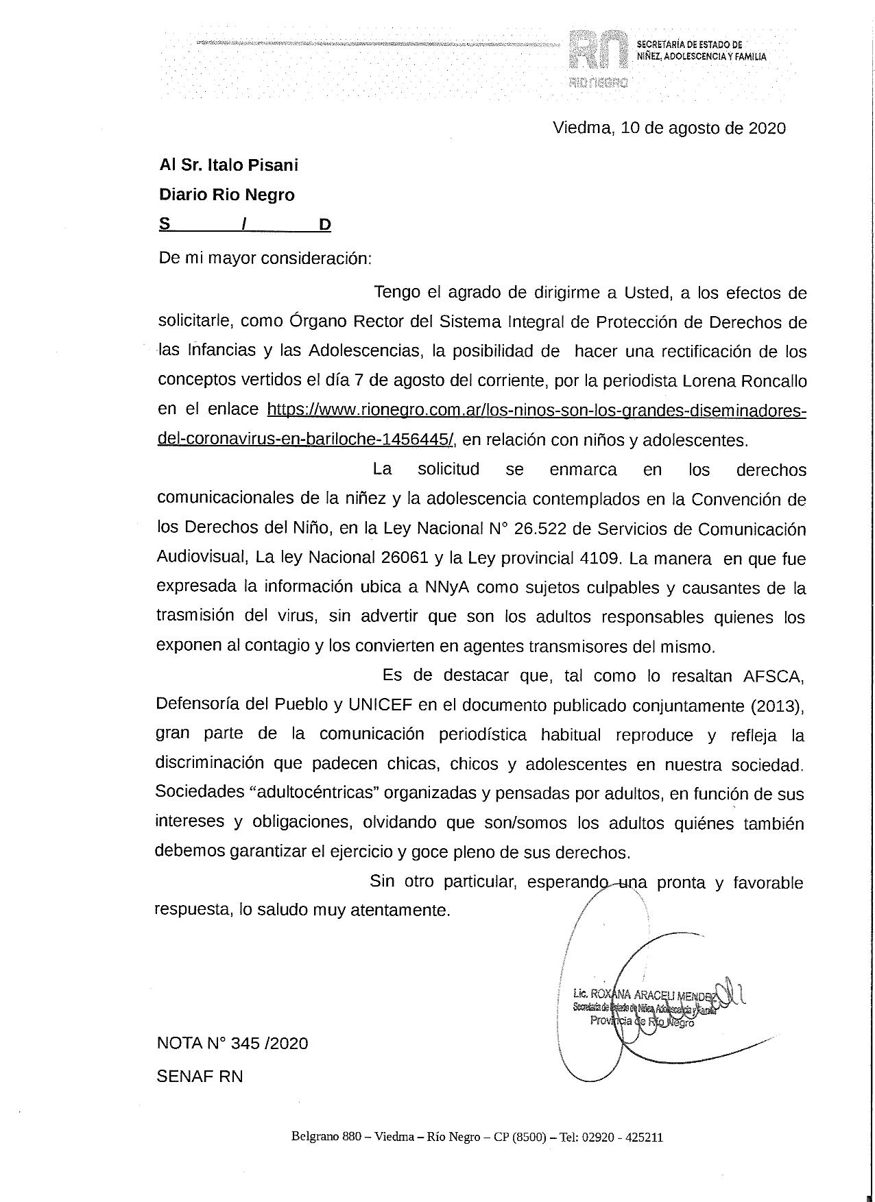 La Secretaria de Estado de Niñez, Adolescencia y Familia de Río Negro planteó objeciones al artículo precedente y pidió se rectifique la nota con el argumento de se señala a los niños y adolescentes «como sujetos culpables» de la transmisión del virus, «sin advertir que son los adultos responsables quienes los exponen al contagio y los convierten en agentes transmisores».