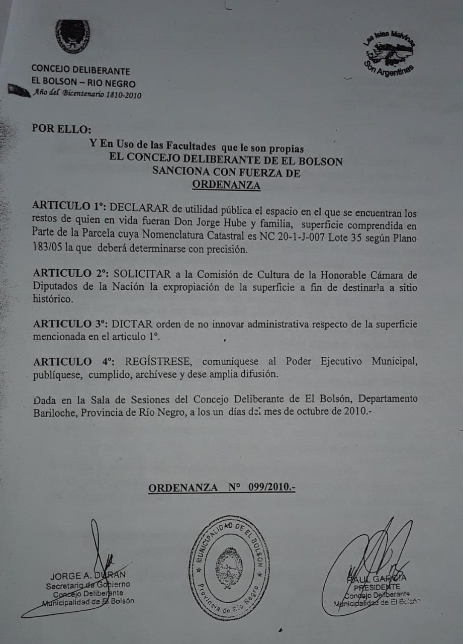 En 2010, el Concejo Municipal de El Bolsón aprobó una ordenanza, a pedido de los antiguos pobladores, declarando de utilidad pública el cementerio donde se encuentran los restos de Jorge Hube y su familia y ordenó no innovar. También solicitaba a la Comisión de Cultura de la Cámara de Diputados expropiar la superficie para declararla sitio histórico.