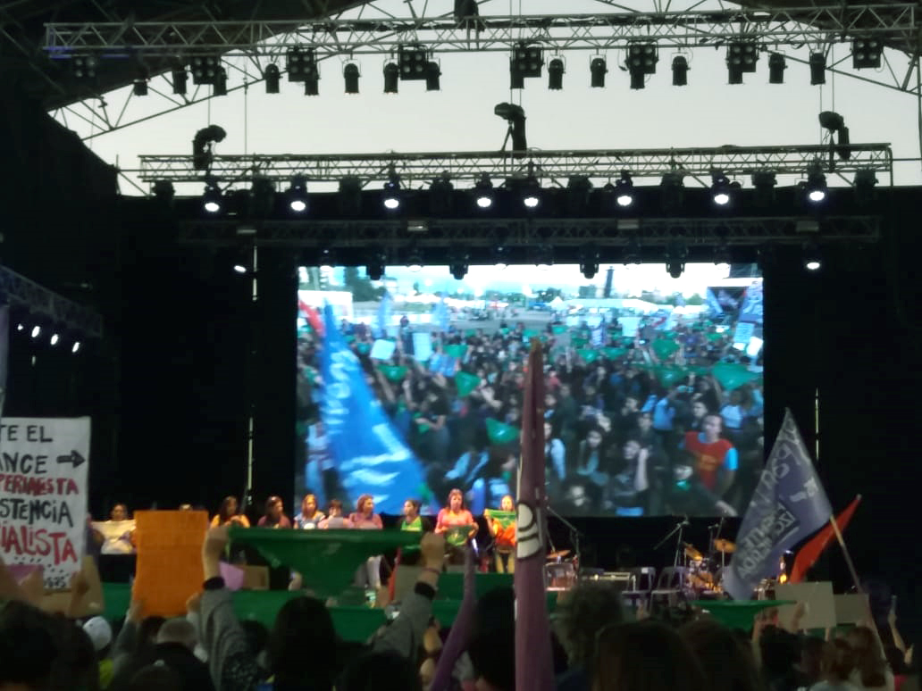 «En nuestras casas y nuestros lugares de trabajo, paramos porque decimos ¡basta! de este sistema capitalista, machista y patriarcal que nos explota, nos viola y nos mata», empezó la elocución de las mujeres y generó revuelo entre los que esperaban ver bandas y espectáculos.
