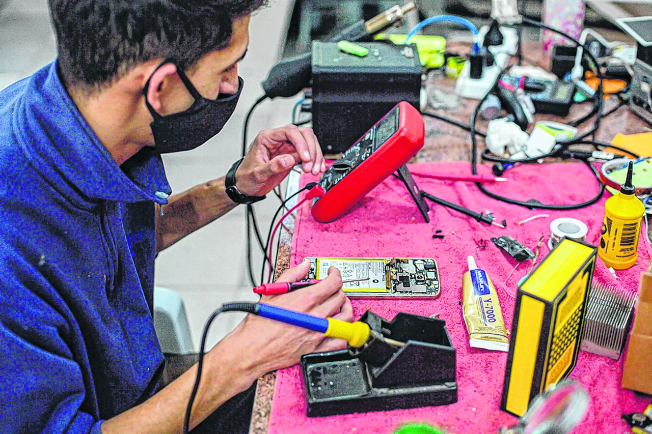 “Los celus tienen el triple de uso que antes de la pandemia”, explicó Ulises Vidal. Junto a Nahuel Escobar son dos jóvenes que reciben trabajos para reparaciones y mantenimiento.