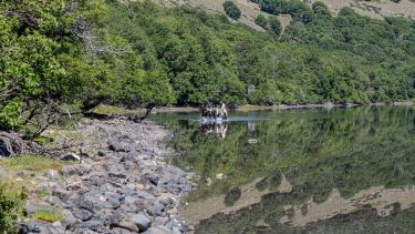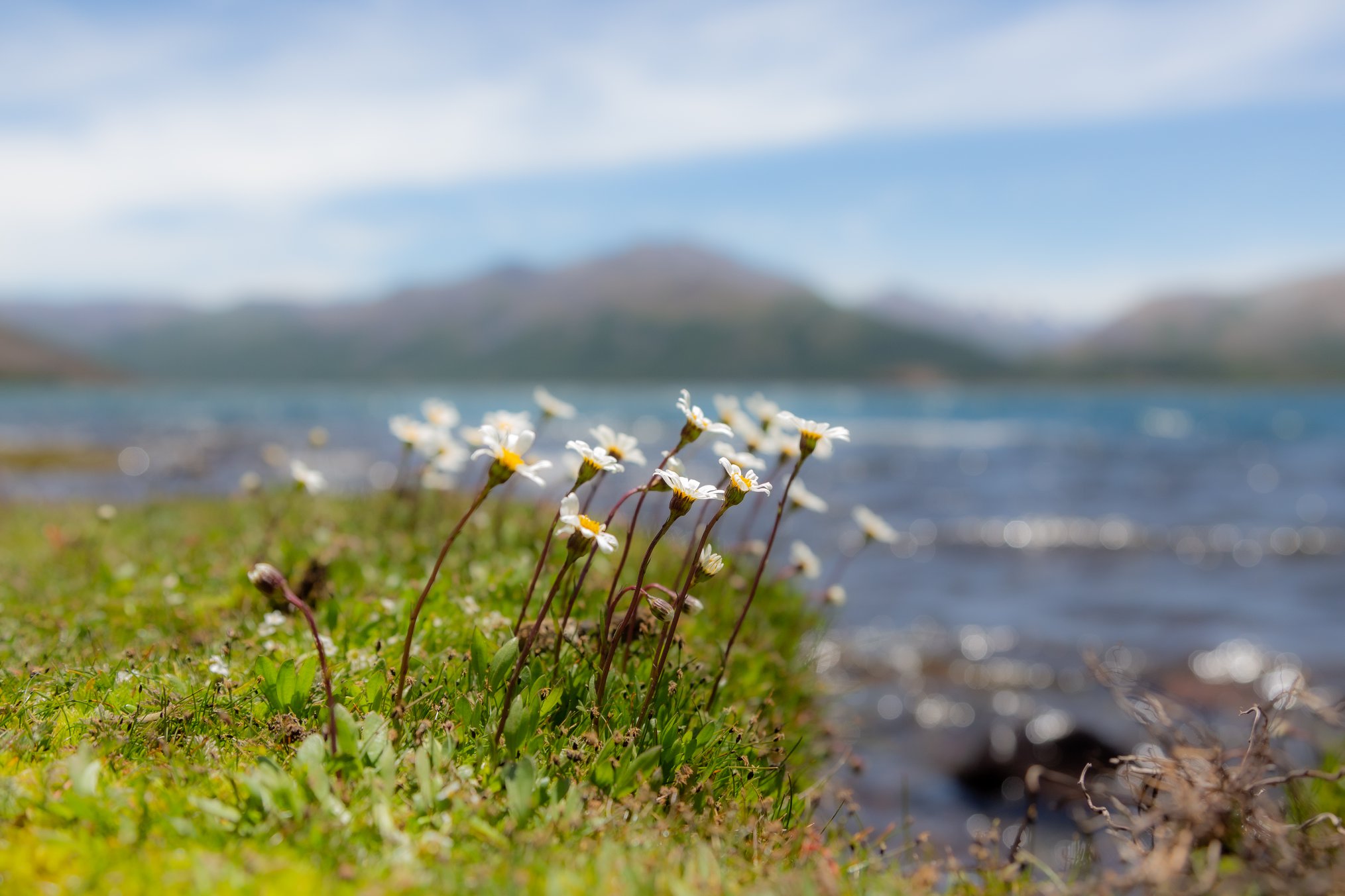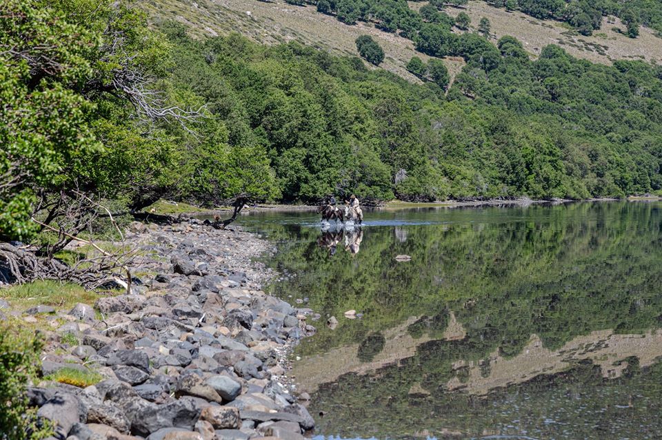 Estos dos gauchos vienen orillando una de las márgenes de la laguna Epulauquen mientras que unos metros más allá crecen, elegantes, unas margaritas blancas tan pequeñas como bonitas que le aportan su toque de delicadeza a toda esta belleza.