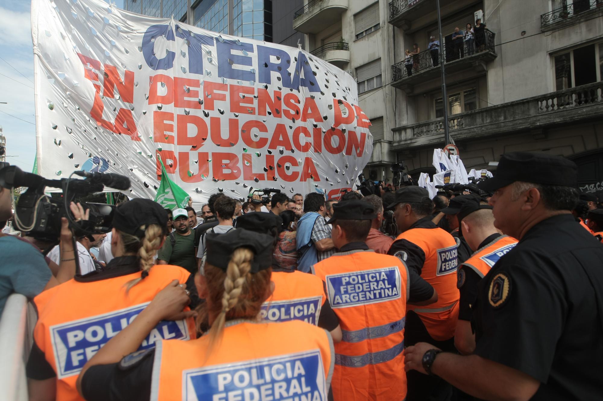 “Argentina se está poniendo de pie”, dijo Macri al inicio de su discurso, acompañado por aplausos. Mientras tanto, en la vía pública, docentes agrupados en la CTERA traspasaron el cerco policial y reclamaban por la convocatoria a la paritaria nacional para el sector.