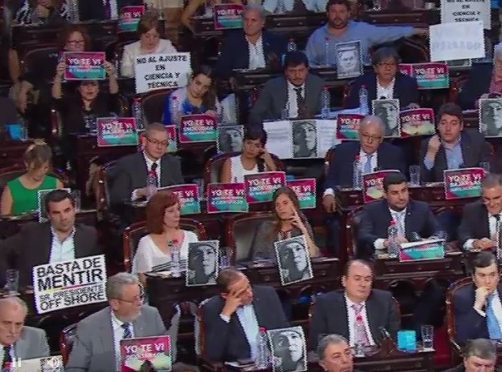 Pese a los pedidos de silencio de la presidente del Senado, Gabriela Michetti, varios le gritaron desde sus bancas y exhibieron carteles de repudio entre los que recordaron la acusación por las cuentas offshore y señalaron: “yo te vi perdonarte 70 millones”. Los aplausos y cánticos de “Sí, se puede”, fueron cruzados gritando “Correo”, en alusión al controvertido acuerdo.