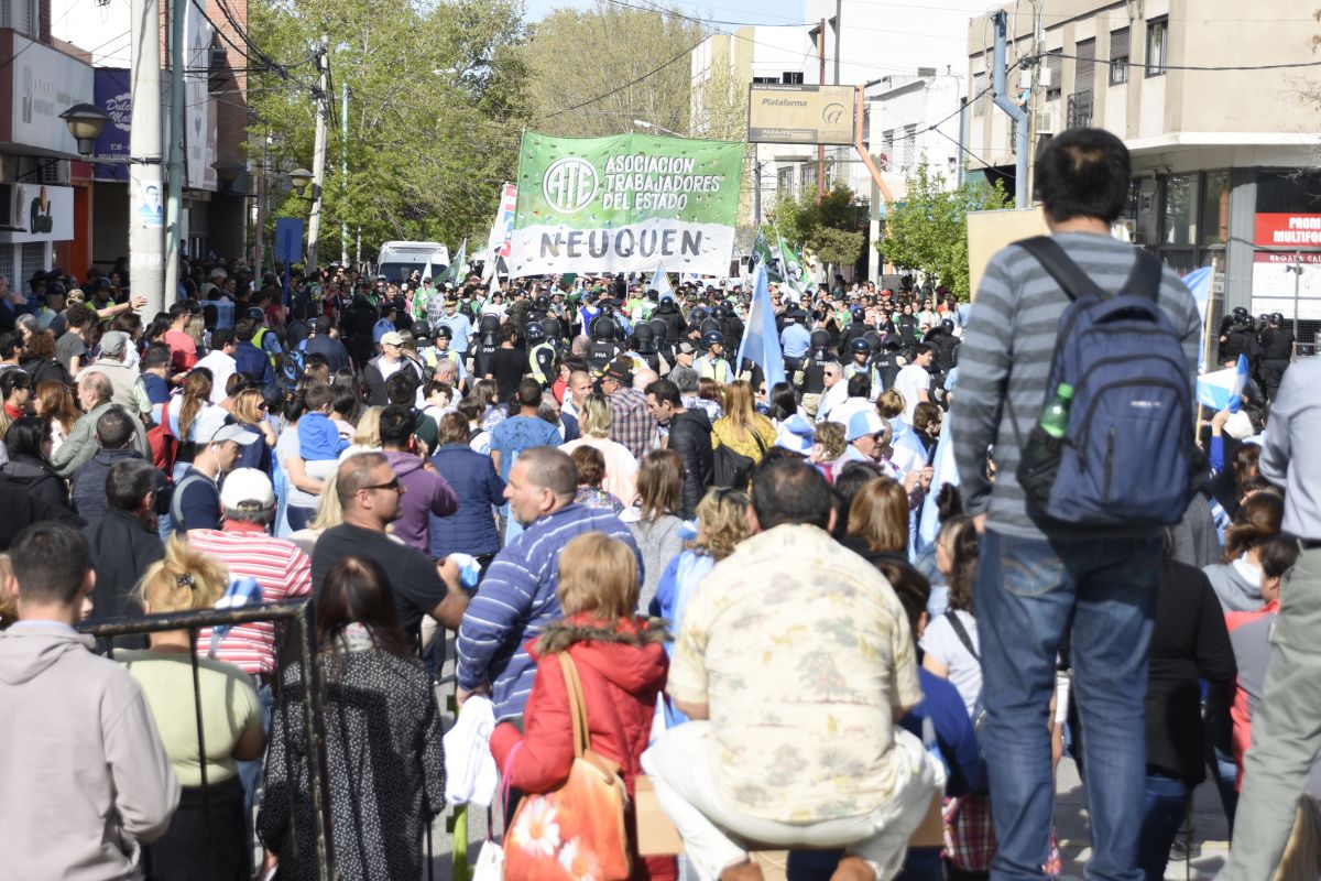 La Asociación Trabajadores del Estado (ATE) Neuquén se movilizó para repudiar el acto de campaña del presidente Mauricio Macri. Una nutrida columna de afiliados al gremio estatal se movilizó hasta el sector vallado donde minutos más tarde se iba a realizar la actividad convocada por el candidato de Cambiemos y mandatario nacional.