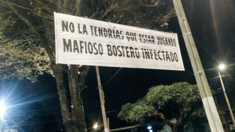 «No la tendrías que estar jugando, mafioso bostero infectado», fue el mensaje de unos de los pasacalles que se viralizó en las redes sociales