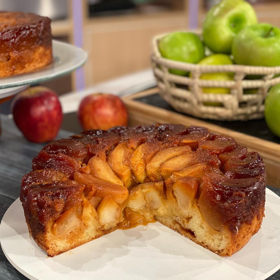 Armado: cubrir la base de un molde desmontable de 22 cm bien enmantecado con papel manteca, cubrir con el caramelo y los cuartos de manzanas. Colocar por encima la mezcla del bizcocho y hornear a 160° C hasta que quede dorada y bien cocida. Retirar, desmoldar cuando este tibia y chorrear con el caramelo que habíamos reservado.