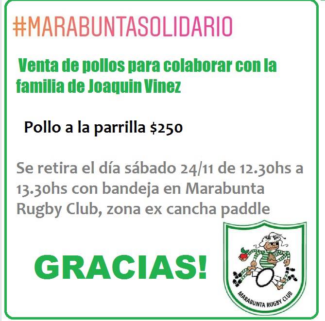 El Club Marabunta inició esta semana una campaña solidaria para ayudar a la familia de Joaquín Vinez, el joven rugbier asesinado el domingo pasado. Se realizó una venta de pollos y además se abrió una cuenta bancaria para todos los que deseen donar dinero. Una de las colaboradoras, Cecilia Locacciato, explicó que surgió la propuesta debido a que Joaquín trabajaba para ayudar con la economía del hogar.