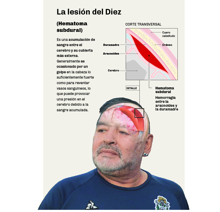 Ayer, el médico personal del Diez, Leopoldo Luque, decidió mantenerlo en observación para realizarle más controles, que se concretaron durante el transcurso de esta mañana. Entre ellos, se sumó una tomografía que arrojó como resultado un hematoma cerebral.