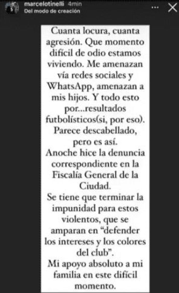 «Cuanta locura, cuanta agresión. Qué momento difícil de odio estamos viviendo. Me amenazan vía redes sociales y WhatsApp, amenazan a mis hijos. Y todo esto por resultados futbolísticos (sí, por eso). Parece descabellado, pero es así», escribió Tinelli en su cuenta de Instagram.