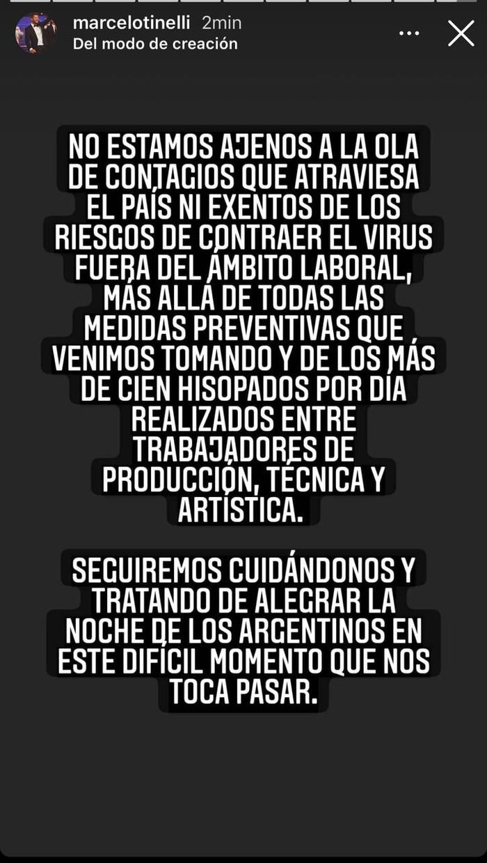 «No estamos ajenos a la ola de contagios que atraviesa el país ni exentos de los riesgos de contraer el virus fuera del ámbito laboral. Más allá de todas las medidas preventivas que venimos tomando y de los más de cien hisopados por día realizados entre trabajadores de producción, técnica y artística. Seguiremos cuidándonos y tratando de alegrar la noche de los argentinos en este difícil momento que nos toca pasar», cerró el animador.