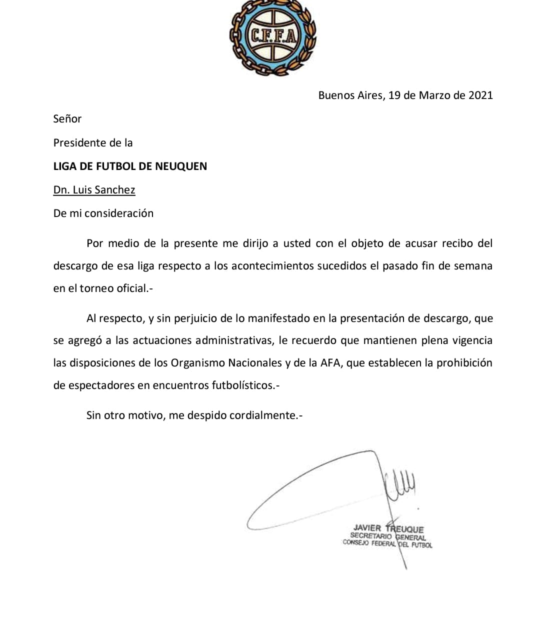 Por disposición del Consejo Federal, los partidos de la Copa Neuquén serán a puertas cerradas luego de que la liga permitiera el 30% de capacidad en el debut. Los clubes, notificados a última hora, decidieron jugar igual la fecha de mañana.