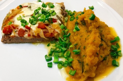 Servir el matambre a la portuguesa o su versión a la pizza acompañado con el puré combinado de calabaza, apio y albahaca. ¡Bombón!