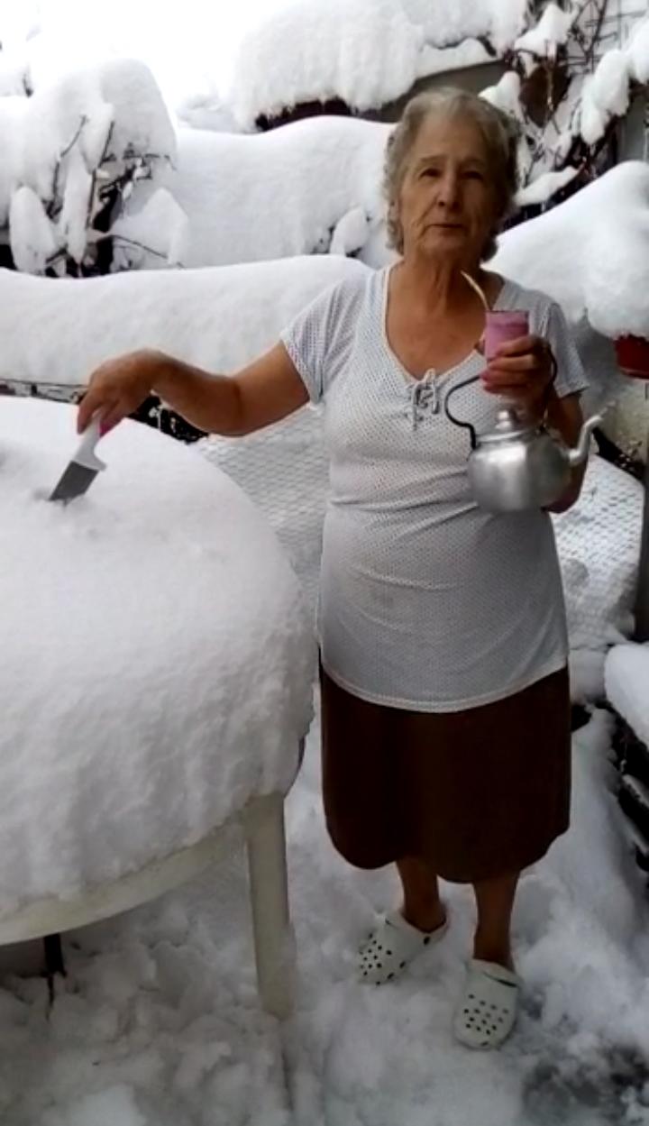 ¿Viste el anterior, ese que se daba el gusto de tomar un helado en la nevada? Este no se le queda atrás: salió a tomar una mates mientras con un cuchillo cortaba la torta… de nieve. Mirá:
