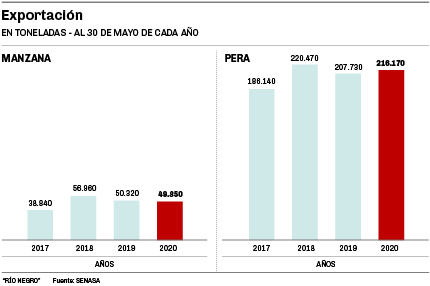 Exportación. Lamentablemente siguen sin despegar. Las estadísticas oficiales detallan que en estos primeros cinco meses de 2020 alcanzaron las 49.800 toneladas, cifra levemente por debajo del año pasado. Existen múltiples factores que permiten predecir la falta de crecimiento de las exportaciones locales, pese a que en los mercados del norte se registraron importantes bajas en la producción. Sin dudas, la baja de calidad en la cosecha es la principal causa, y cuando hablamos de calidad hay que incluir calibres y variedades que demanda hoy el mercado. Es difícil sostener una actividad agroindustrial orientada al sector externo con solo el 16% de lo producido destinado a la exportación. Paradoja pocas veces vista en el mundo frutícola. Otro punto que presenta cierto grado de inconsistencia en este segmento comercial, son los destinos de nuestra oferta exportable. Cerca del 60% de las ventas se orientan a Brasil, Rusia y Bolivia, todos mercados con alto grado de volatilidad económica, bajos precios finales en las góndolas y altos riesgos de cobro.