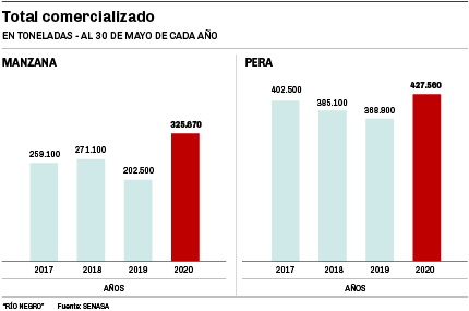 La comercialización de manzanas, que involucra lo destinado para la exportación, mercado interno e industria de concentrados, alcanzó en estos primeros cinco meses del año las 325.600 toneladas, volumen que refleja un salto interanual del orden del 60%.